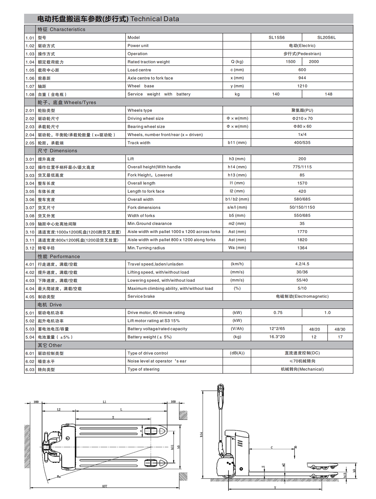 Electric, Pedestrian, 1.5T/2.0T, 2*12V/65Ah,48V/20Ah/30Ah, PU wheels, DC drive control