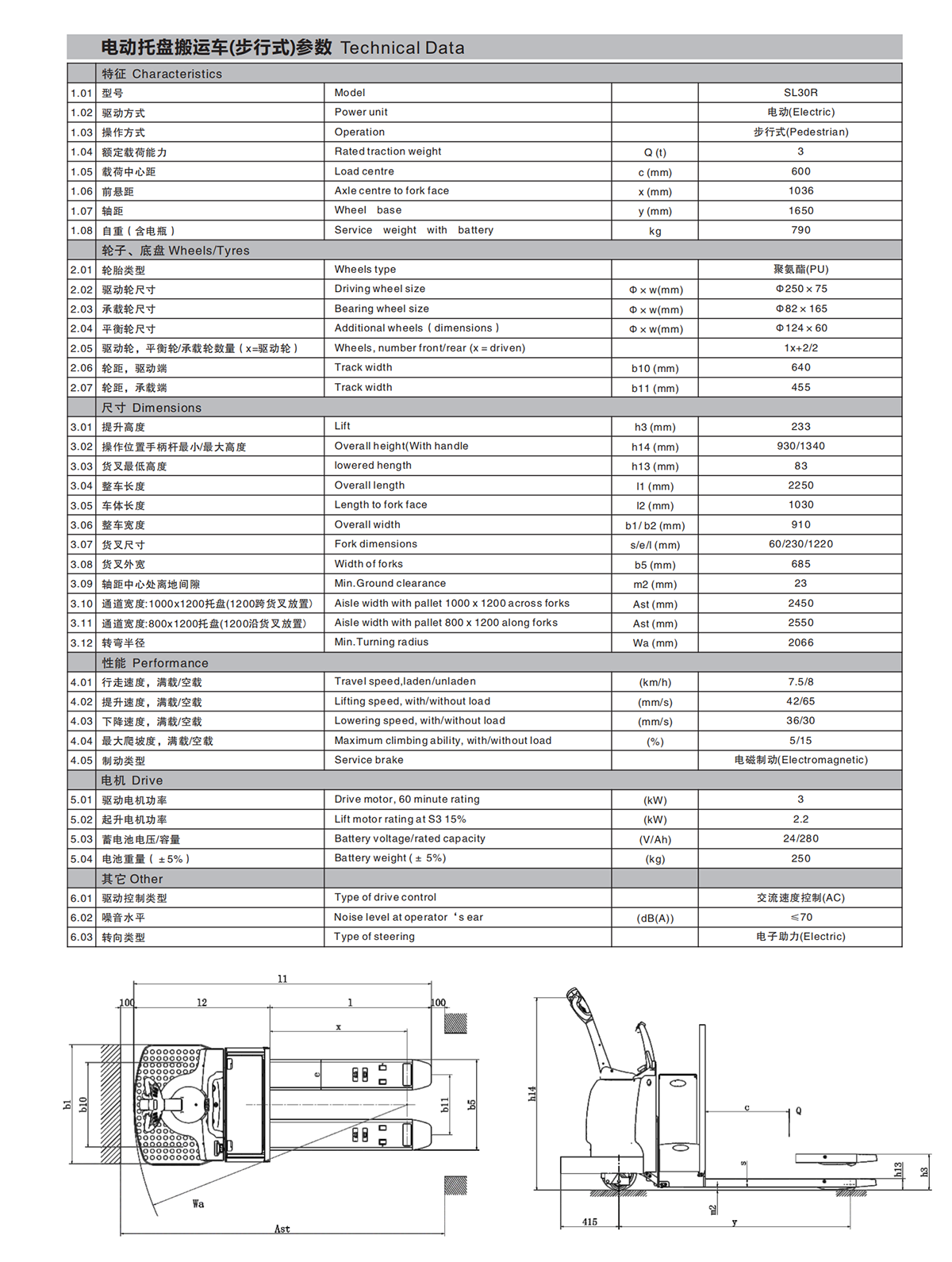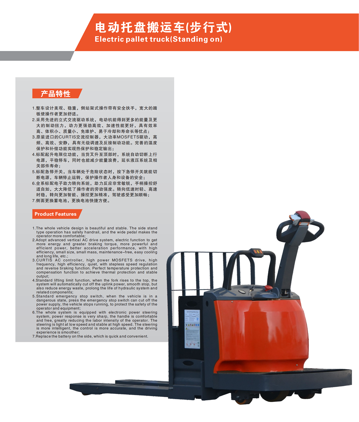 Electric, Standing on, Pedestrian, 24V/280Ah, PU wheels, CURTIS AC controller, High power MOSFETS drive